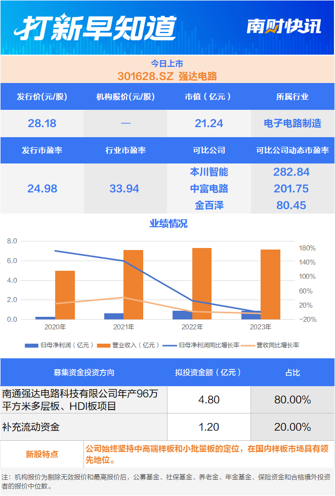 10月31日,有两只新股上市,为创业板的强达电路(301628)(301628.SZ)和北交所的科拜尔(920066.BJ)。