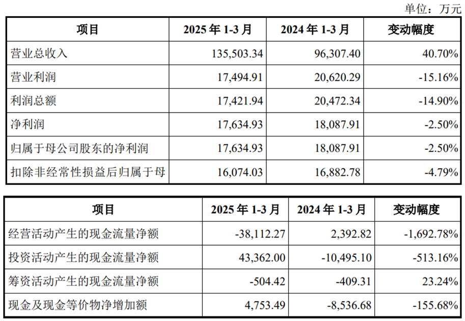 2025年1-3月,公司营业收入为135,503.34万元,同比增加40.70%;净利润/归属于母公司股东的净利润为17,634.93万元,同比下降2.50%;扣除非经常性损益后归属于母公司股东的净利润为16,074.03万元,同比下降4.79%;经营活动产生的现金流量净额为-38,112.27万元,上年同期为2,392.82万元,同比下降1,692.78%。
