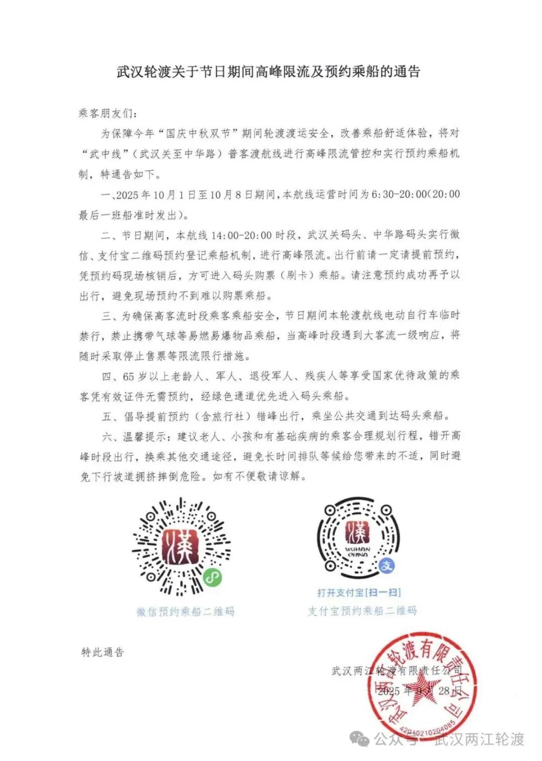 - 2025-10-07 武汉轮渡公告:高峰时段启用预约制