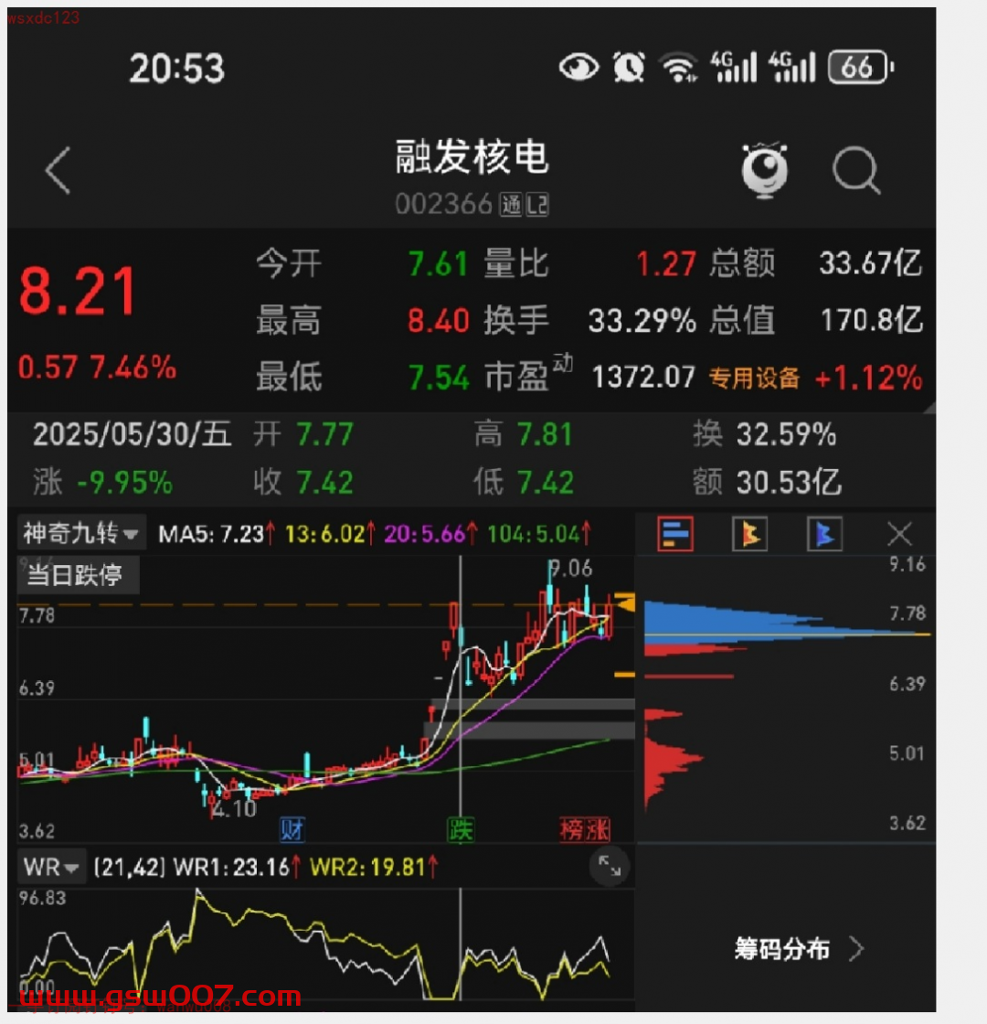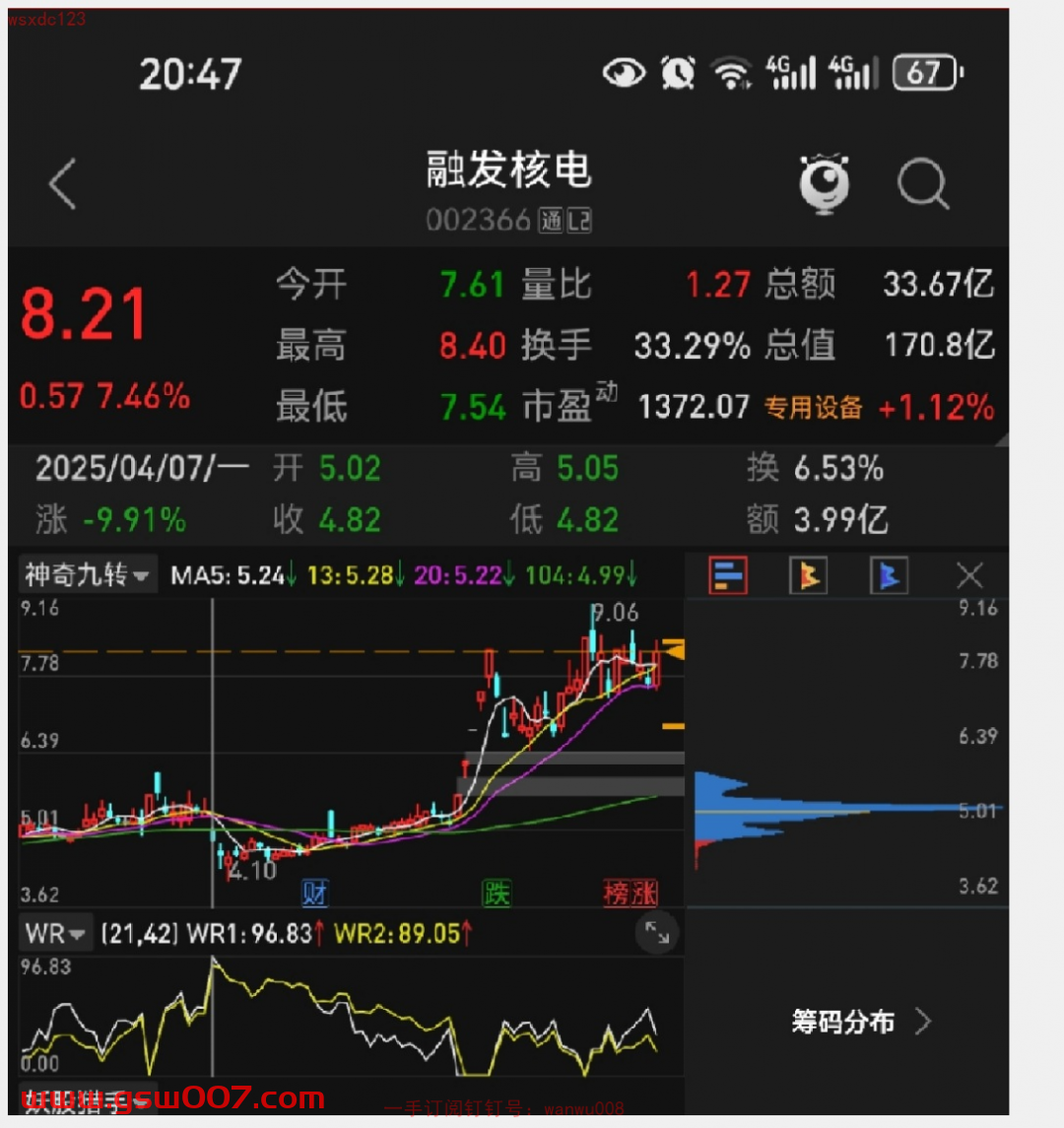 五、案例说明(以文中时间为例) 4 月 7 日:WR 两线重合并超过 90,符合左侧介入条件。 后续:两线逐步向下穿过 80,符合右侧介入跟踪趋势。 5 月 23 日:白线数值降至 0(仍处于持股期,因在 20 以下)。 5 月 30 日:WR 白线上穿 20,触发卖出信号,当天需执行卖出。
