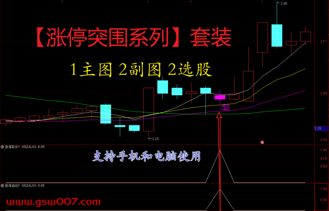 涨停突围指标包含1主图2副图1选股,均线粘合突破后的缩量再启动,无未来函数手机电脑通达信通用,信号仅供参考,涨停启动: