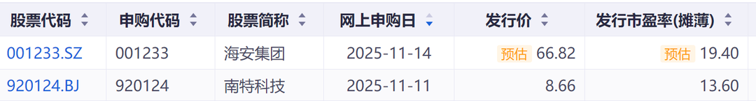 据同花顺(300033)iFinD,下周(11月10日-14日)有2只新股申购,分别是南特科技(11月11日周二)和海安集团(001233)(11月14日周五)。