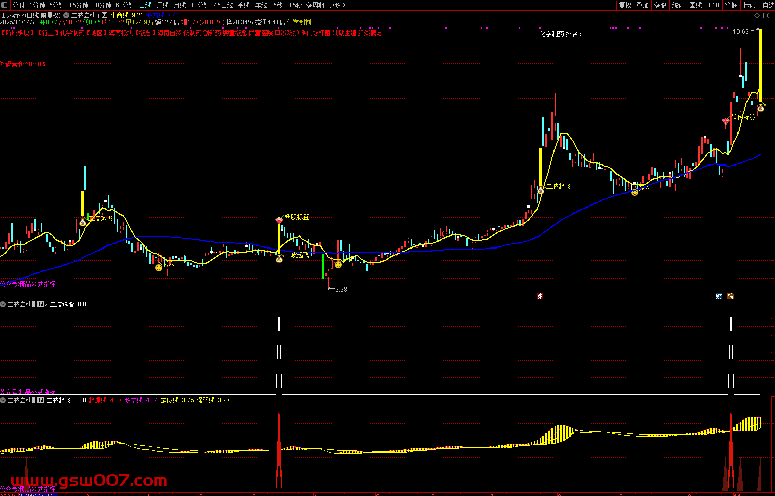 作为前序副图指标的「选股精简版」,这款工具是短线交易者的效率神器。它基于「中小盘+低价+资金介入+趋势反转」四重核心逻辑,从全市场海量标的中快速筛选出即将进入「二波上涨」阶段的潜力股,帮投资者节省无效筛选时间,直接锁定高弹性标的。