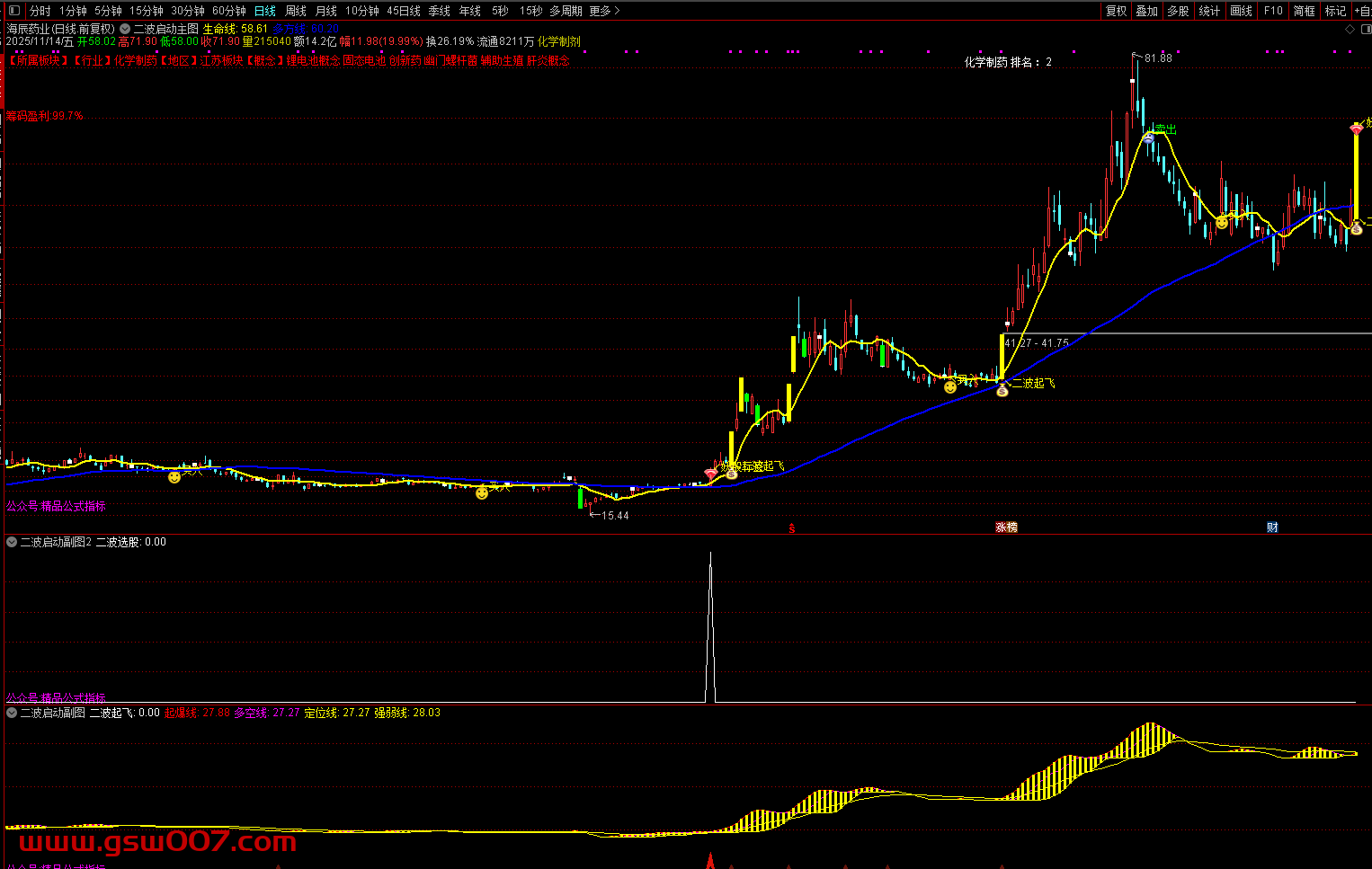 呈现形式:K线下方显示黄色「↘二波起飞」文字,辅以通达信默认上升箭头(图标9)强化提示。