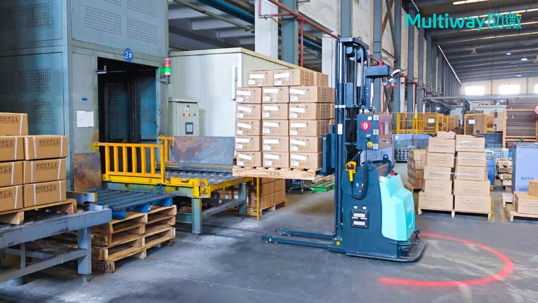 堆高式无人叉车MW-L20:承担产线末端到提升机、入库缓存区间的托盘级物料搬运任务,精准对接提升机,实现高负载、高精度转运;