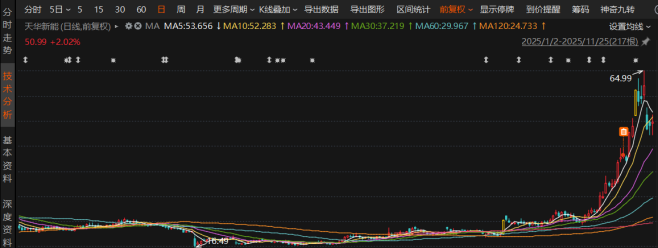 在储能需求爆发带动锂电产业链回暖以及宁德时代26.35亿元战投催化下,天华新能近期股价持续刷新阶段高点,11月20日盘中走高至64.99元/股,触及2023年以来的阶段新高。随后两个交易日股价出现回调,截至11月25日收盘,天华新能报50.99元/股,涨幅2.02%,当前股价仍较年初上涨128.85%。