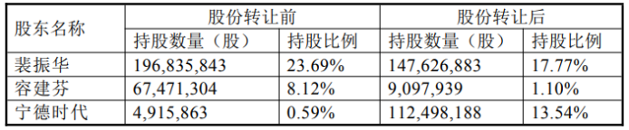 10月31日,天华新能发布公告称,公司实控人裴振华、容建芬夫妇与宁德时代签署股份转让协议,拟向宁德时代协议转让1.08亿股公司股份,占总股本的12.95%。其中,裴振华转让4920.9万股,容建芬转让5837.34万股。上述股份转让价格为每股24.49元,转让价款合计26.35亿元。