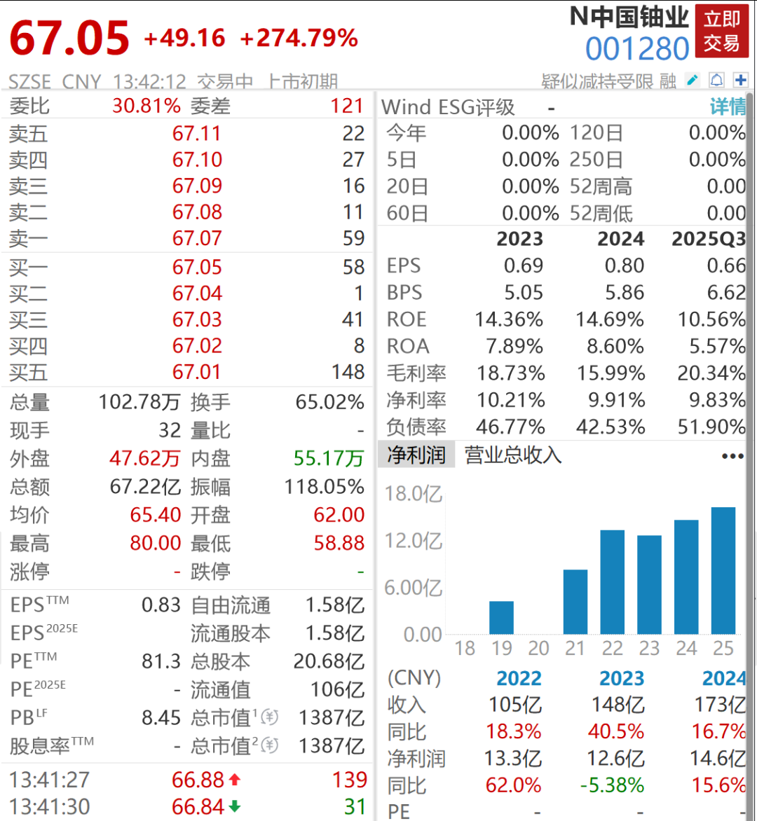 12月3日,有着“铀业第一股”之称的中国铀业(001280)上市,盘中大涨近350%。