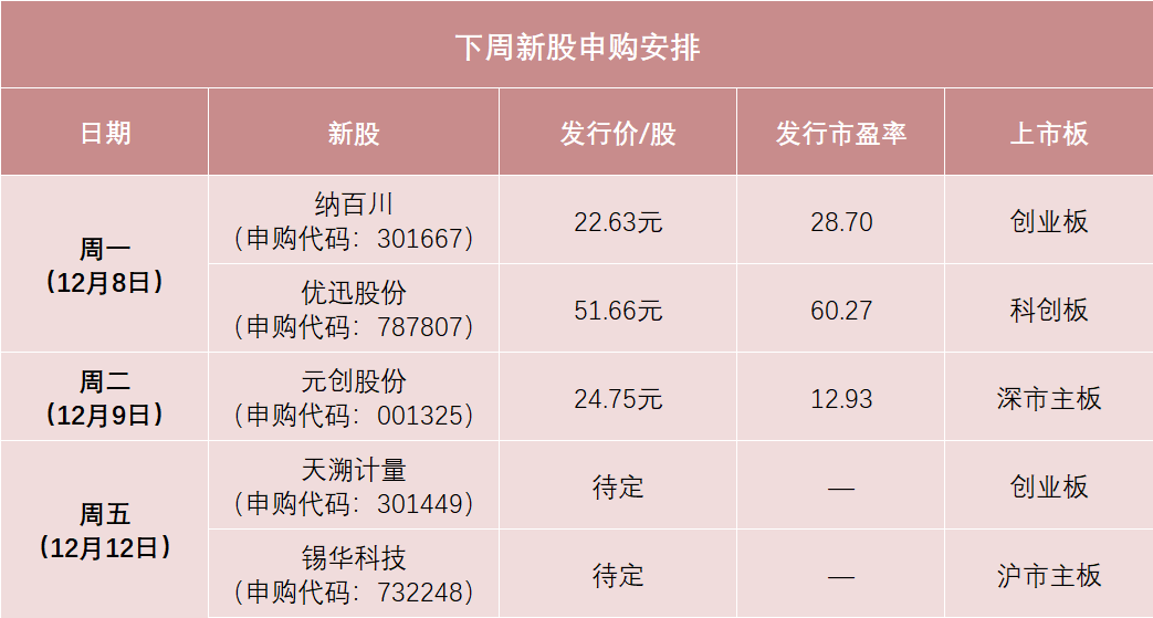 从日程安排看,周一(12月8日)可申购创业板新股纳百川(301667)、科创板新股优迅股份,周二(12月9日)可申购深市主板新股元创股份(001325),周五(12月12日)可申购创业板新股天溯计量(301449)、沪市主板新股锡华科技(603248)。