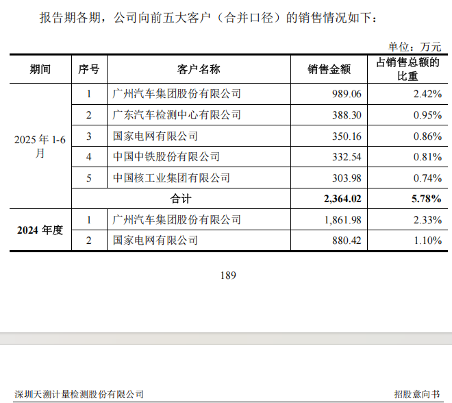 2025年上半年,天溯计量的前五大客户分别是广州汽车集团股份有限公司、广东汽车检测中心有限公司、国家电网有限公司、中国中铁(601390)股份有限公司、中国核工业集团有限公司。