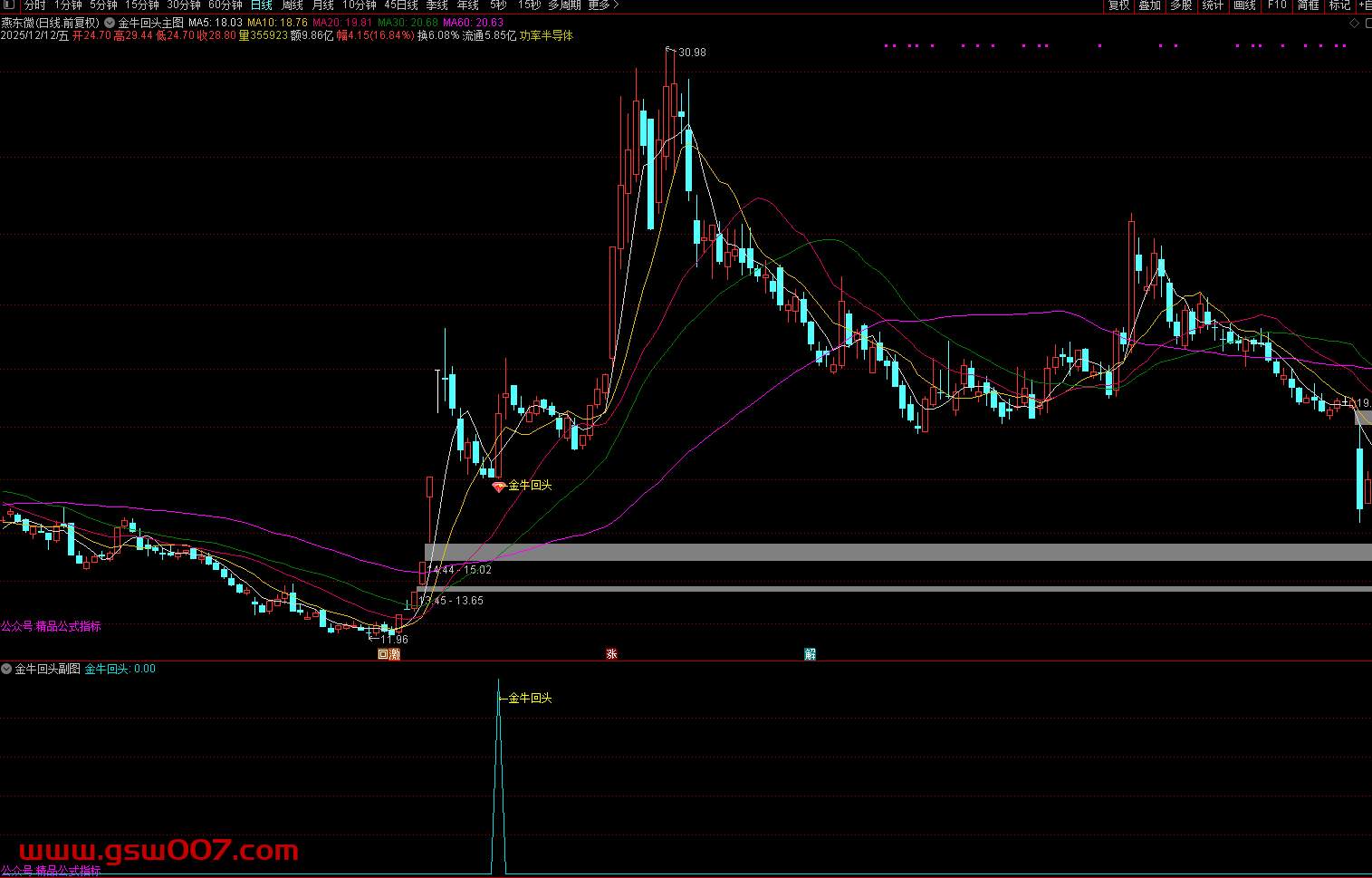 这款【金牛回头接人上车 6.0 版】指标是针对主力洗盘后二次拉升行情打造的全套分析工具,整合主图、副图、选股公式三大模块打包呈现,且完成最新参数适配优化,核心捕捉强势涨停回调后主力吸筹完毕的上车机会,具体指标特性与选股逻辑如下:
