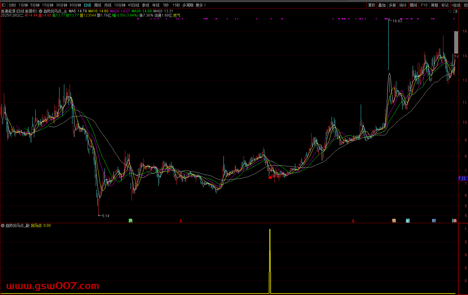 - 趋势核心判断:指标通过测算短期 EMA(6 日周期)与长期 EMA(11 日周期)的乖离度,结合股价回调节奏,精准绘制黄色 “回马点” 信号,直观标识趋势回调后的关键介入节点。