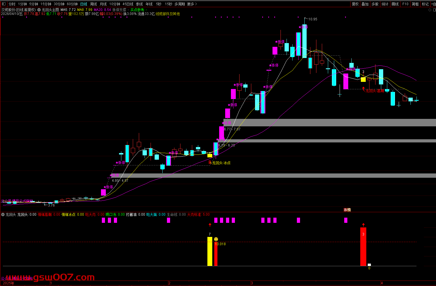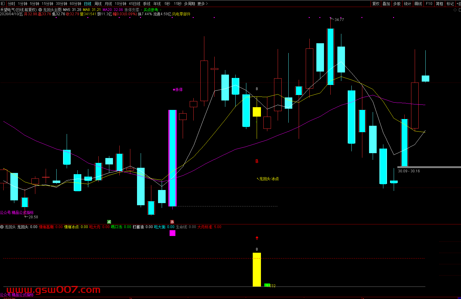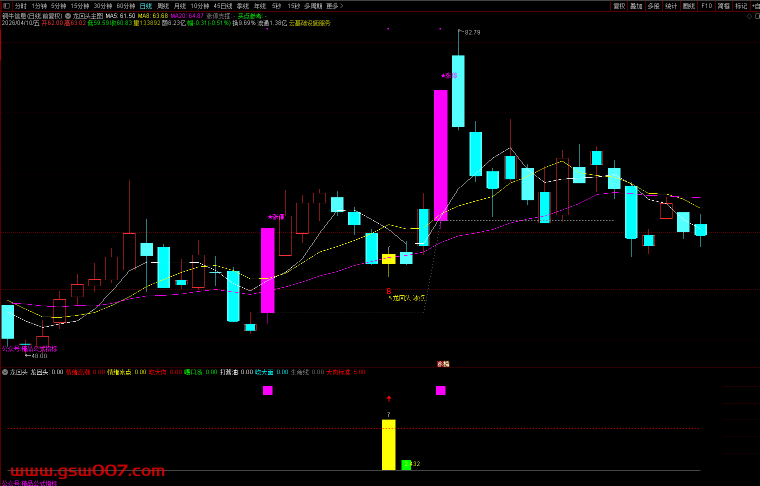 龙头涨停:副图上方出现紫色柱线,表示该股当日涨停,确认为龙头标的。
