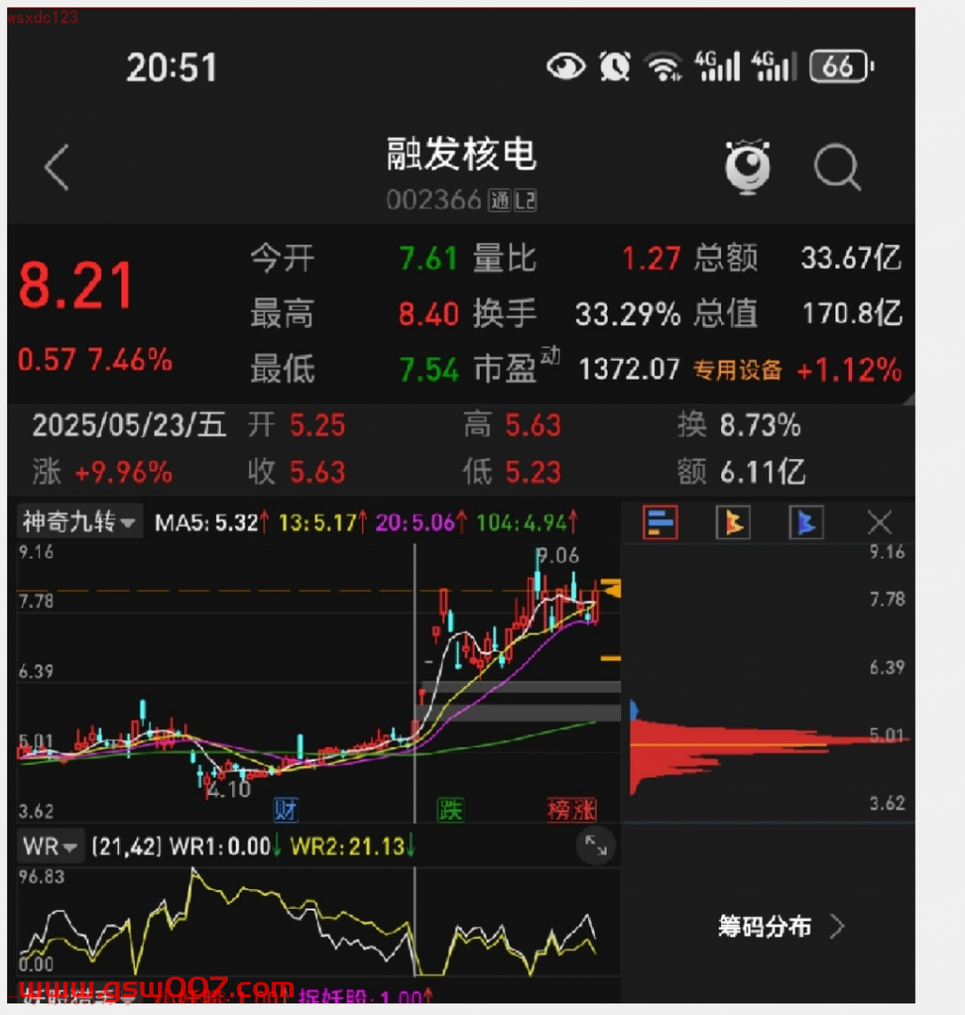 五、案例说明(以文中时间为例) 4 月 7 日:WR 两线重合并超过 90,符合左侧介入条件。 后续:两线逐步向下穿过 80,符合右侧介入跟踪趋势。 5 月 23 日:白线数值降至 0(仍处于持股期,因在 20 以下)。 5 月 30 日:WR 白线上穿 20,触发卖出信号,当天需执行卖出。