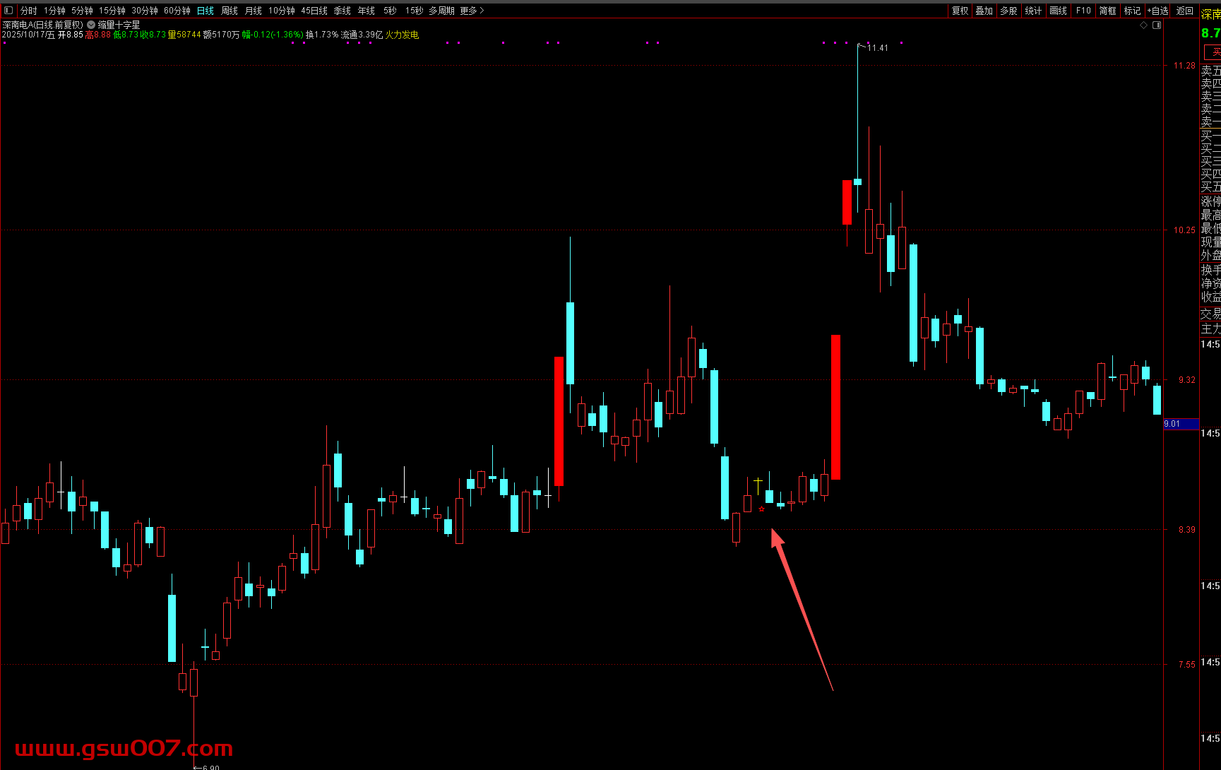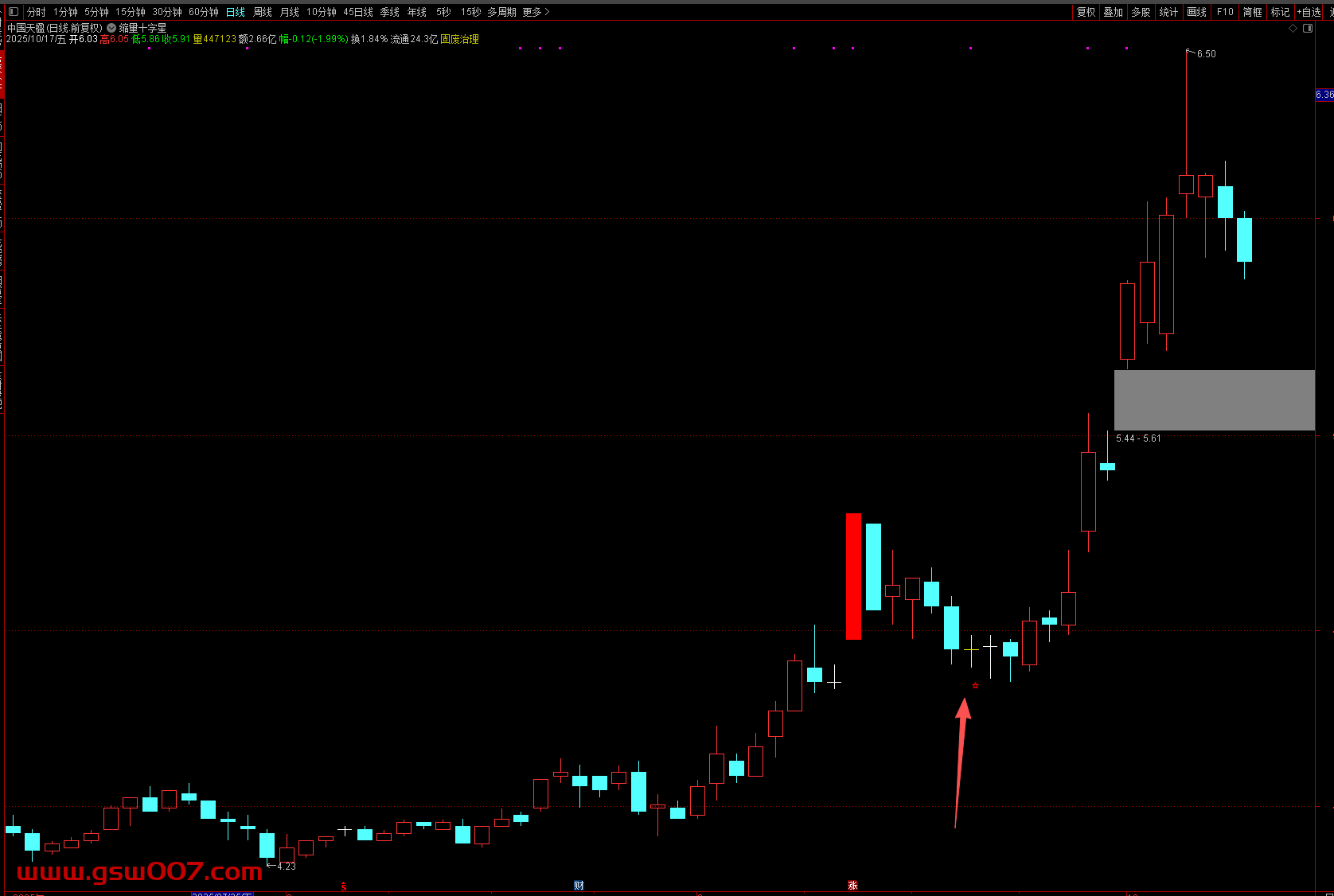值得注意的是,回调周期中量能表现整体呈现缩量特征,当出现首板回调以来的最小量能十字星形态时,主图会同步显示黄色十字星标识,其下方伴随红色五角星标记 —— 该红色五角星对应的位置,即为该选股指标所筛选出的目标标的。