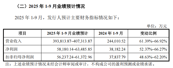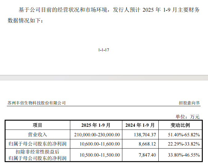 招股意向书显示,丰倍生物预计其2025年前三季度的营业收入为21亿元至23亿元,同比增长51.40%至65.82%;归母净利润为1.06亿元至1.16亿元,同比增长22.29%至33.82%。