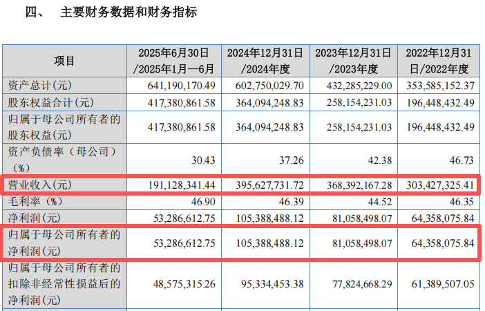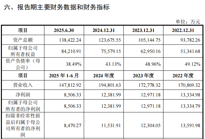2022年至2024年及2025年上半年,丰倍生物的营业收入分别为17.09亿元、17,28亿元、19.48亿元及14.78亿元,归母净利润分别为1.33亿元、1.30亿元、1.24亿元及8506.33万元。