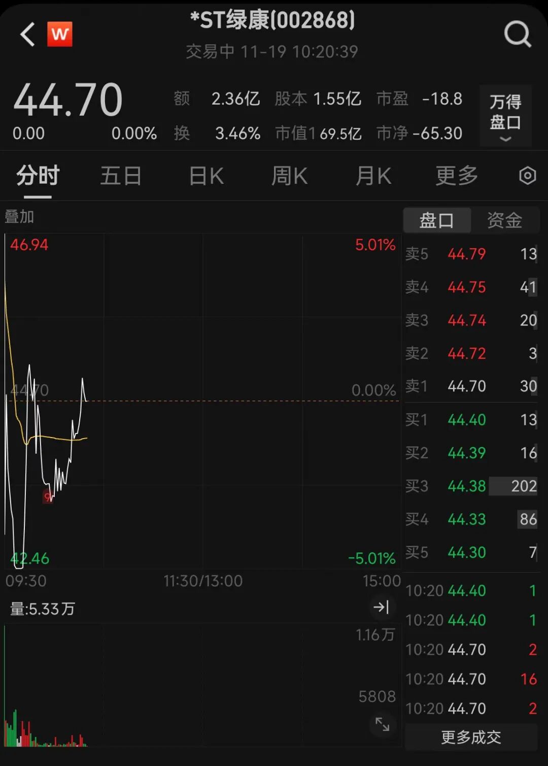 19日早间,以涨停价开盘的*ST绿康(002868)直线跳水,不到7分钟就触及跌停,一度上演“天地板”,暂时按下连板9进10的中止键。