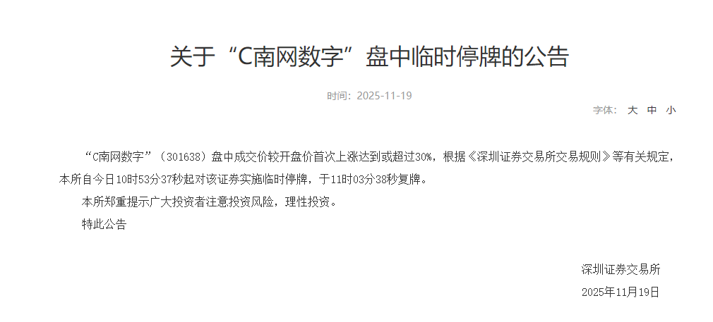 - 2025-11-19 “C南网数字”盘中临时停牌