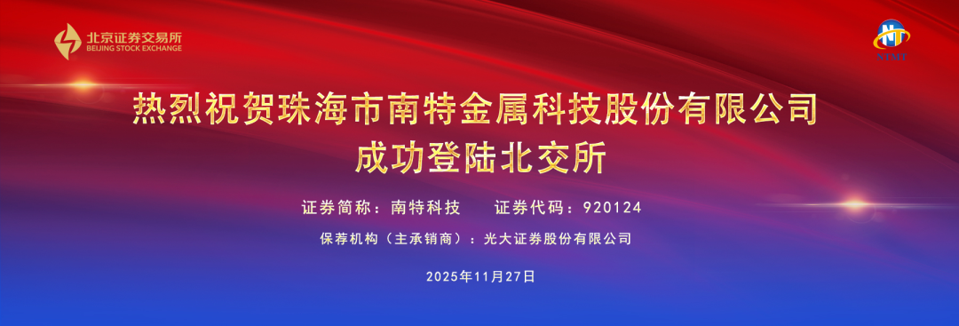 2025年11月27日,珠海市南特金属科技股份有限公司(证券代码:920124)在北交所上市。