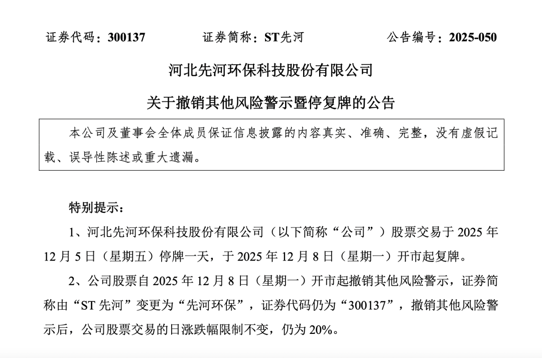 12月4日晚间,ST先河发布公告,公司股票自12月8日(星期一)开市起撤销其他风险警示,证券简称由“ST先河”变更为“先河环保”。撤销其他风险警示后,公司股票交易的日涨跌幅限制不变,仍为20%。公司股票交易于12月5日(星期五)停牌一天,于12月8日(星期一)开市起复牌。