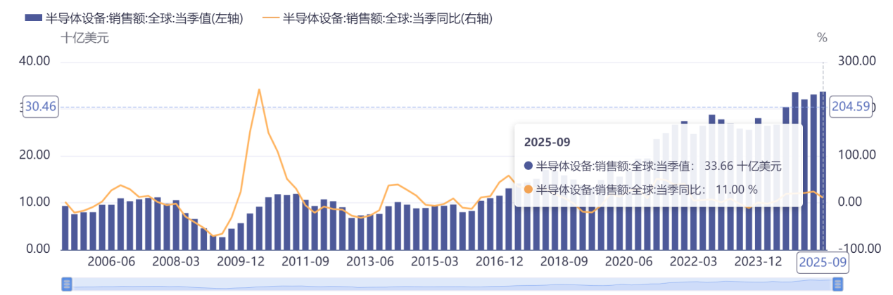 据SEMI最新数据显示,2025年第三季度全球半导体设备销售额同比增长11%,达到336.6亿美元,环比增长2%,增长强劲。销售额增长主要得益于先进技术领域的强劲投资,特别是面向人工智能计算的高端逻辑芯片、DRAM及先进封装解决方案。