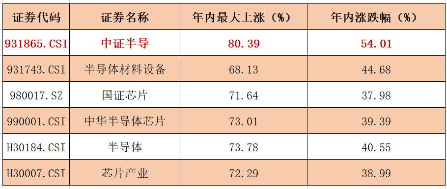 从年内表现来看,截至昨日,2025年中证半导年内涨幅为54%,区间最大上涨超80%,在中华半导体芯片、国证芯片、芯片产业等主流半导体指数中位列第一,弹性突出。