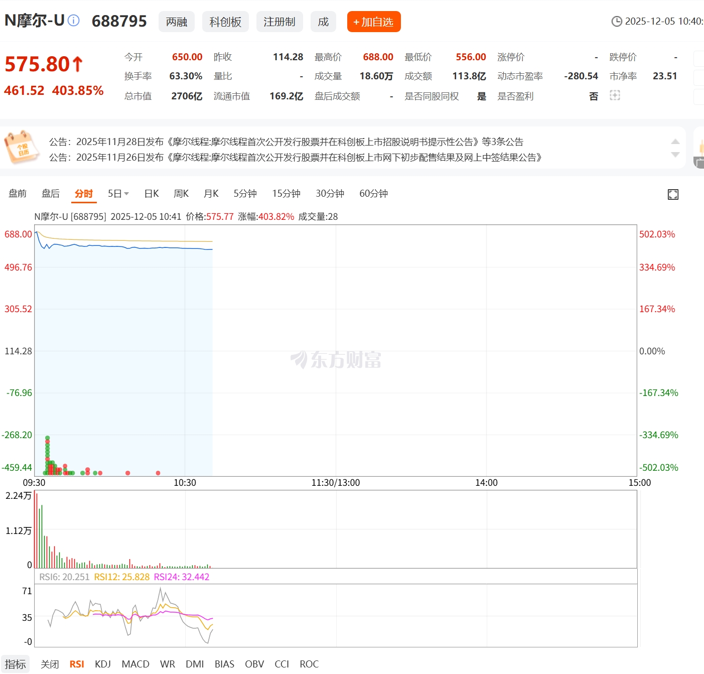 - 2025-12-05 摩尔线程开盘大涨468.78%,市值超3000亿元!单签盈利近27万元