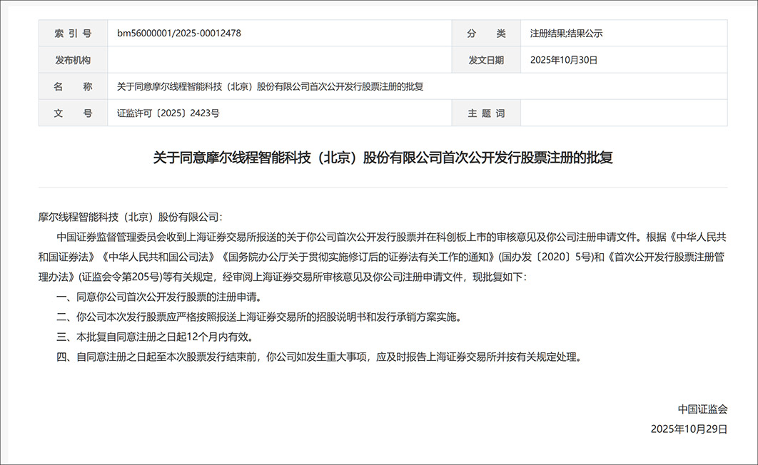 此前10月30日,证监会官网发布了关于同意摩尔线程智能科技(北京)股份有限公司(下文简称为“摩尔线程”)首次公开发行股票注册的批复,同意摩尔线程科创板IPO注册申请,批复自同意注册之日起12个月内有效。
