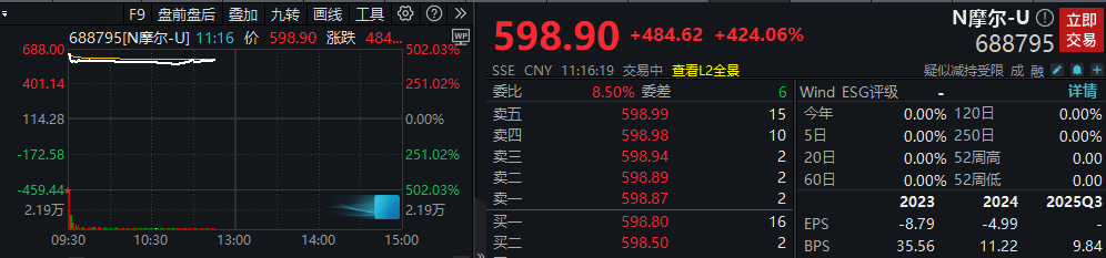 12月5日,被誉为“国产GPU第一股”的摩尔线程(N摩尔-U,688795)正式在科创板挂牌上市。早间,该股股价开盘即涨超468%,最高触及688元/股,公司市值一度超过3000亿元。截至发稿,该股报598.90元/股,涨幅仍有424.06%。