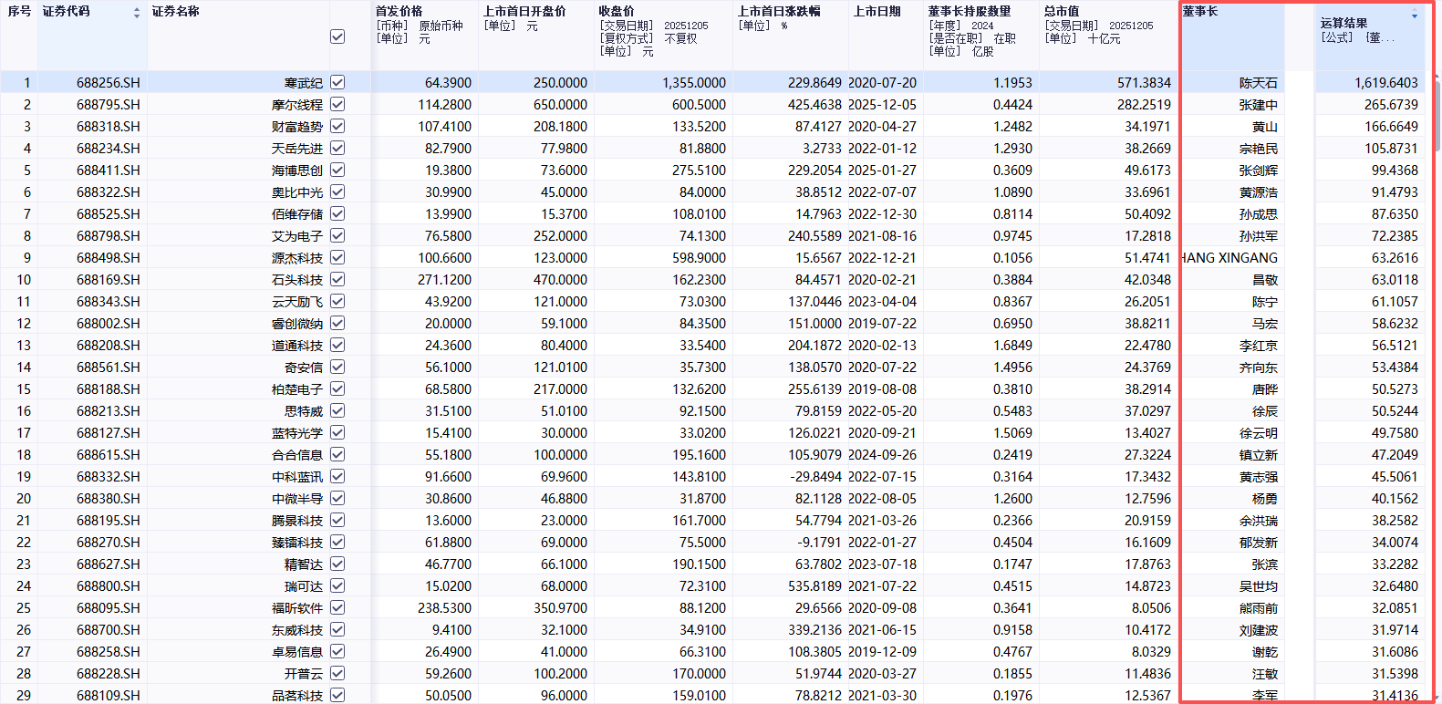 同花顺(300033)iFinD数据显示,仅就直接持股数量测算,张建中上市首日的身价已跃居创业板新一代信息技术产业掌门人身价排行第二位,仅次于寒武纪-U(688256.SH)董事长陈天石(1619.64亿元)。