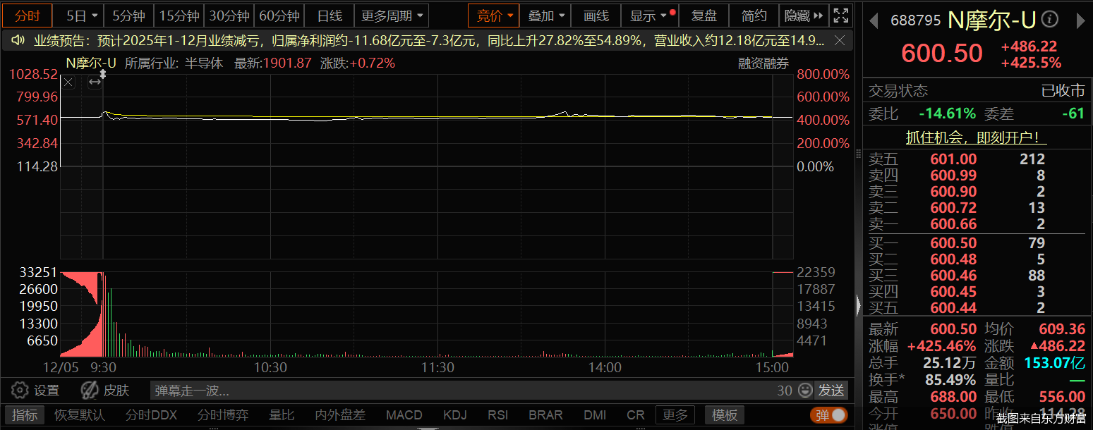 - 2025-12-05 摩尔线程首日大涨425.46%!中一签赚24万,投资者赢麻了