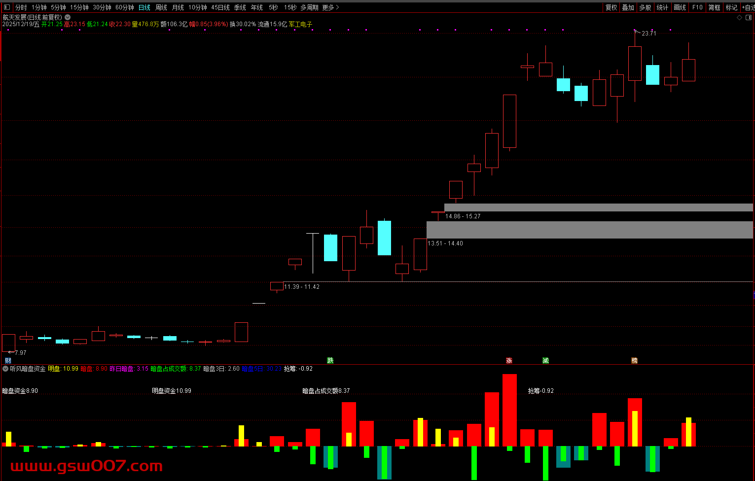 可结合明盘、暗盘资金的流向特征辅助研判短期多空力量:
