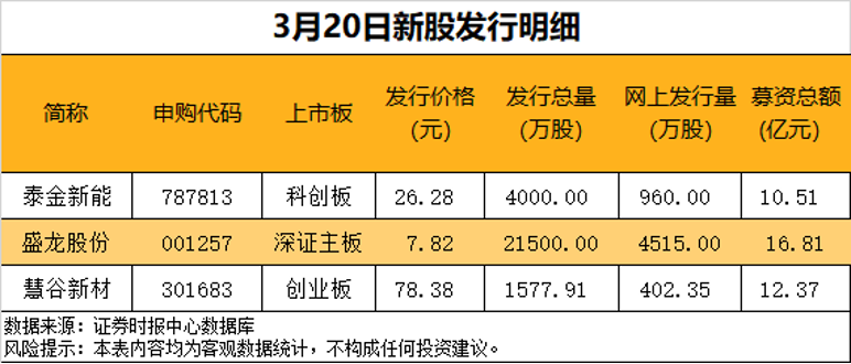 今日(3月20日)共有3只新股集中发行,分别是科创板的泰金新能、深市主板的盛龙股份(001257)、创业板的慧谷新材(301683)。