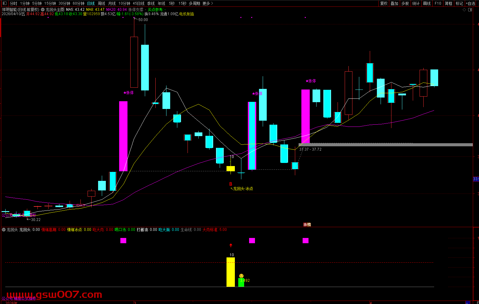 龙头涨停:副图上方出现紫色柱线,表示该股当日涨停,确认为龙头标的。