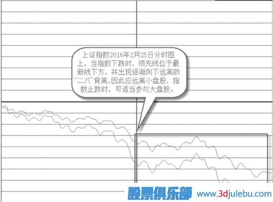 C.指数下跌、“二八”背离出现时,领先线往往在最新线下方运行,并出现逐渐向下远离领先线。 图2-3 上证指数:2016年2月25日分时图实战案例从2016年2月25日上证指数分时图中可以看出,当指数出现下跌时,领先线一直位于最新线下方,并逐渐出现向下的远离,形成双线背离。而正常的情况是,指数下跌时,占指数成分较大的最新线会领跌。因此,这种背离状况说明,盘中小盘股的杀跌力量较大,所以应当在此时刻远离小盘股,并时刻观察,如发现指数止跌时,可适当参与大盘股。以上说明如图2-4所示。图2-4 上证指数:2016年2月25日分时图技术要领1.指数下跌、“二八”背离有时会出现较大背离,即盘中大盘股处于上涨,而小盘股却全面杀跌,此时往往是权重股护盘、小盘股杀跌的情况,此时虽然指数杀跌不大,但盘中小盘股却往往出现跌停一片,因此应远离小盘股。